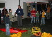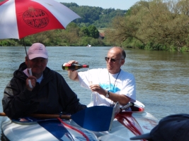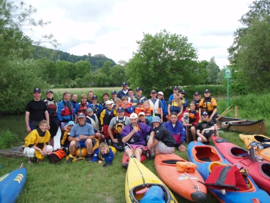 Weickersgrüben Vom weiten Weg ins Frankenland ließen sich 38 junge und jung gebliebene Kanuten nicht abschrecken und erbrachten somit die Pfingsttage an der Fränkischen Saale. Bei bestem Paddelwetter ließen alle Paddler ihre Boote zu Wasser und erfreuten sich der schönen Landschaft. Alle? Nein, ein Kanute ließ es sich nicht nehmen, samt Begleitung das neu eröffnete Krankenhaus in Hammelburg zu besuchen, da sein beim "Ausgleichssport" arg lädiertes Bein kein Boot fahren zuließ. Bestens versorgt stand besagter Sportsmann aber schon nach kurzer Zeit wieder am Ufer und konnte den vorbeipaddelnden Kollegen zuwinken. Deutlich größere Schritte machte hingegen Karl Schwippert sonntags beim Anlanden der Boote. Schade nur, dass ihm dabei auf der Treppe zum Wasser die Stufen ausgingen und er mit großem Hallo im Bach landete.