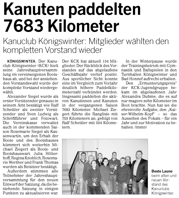 Der Kanu-Club Königswinter (KCK) geht mit einem nahezu unveränderten Vorstand in die neue Paddelsaison. Auf ihrer Jahreshauptversammlung im Rheinhotel Loreley wählten die Kanuten erneut Alexander Siegel zu ihrem Ersten und Peter Klaus zum Zweiten Vorsitzenden. Sven Ludwig wurde zum Schriftführer und Fotowart ebenso wiedergewählt wie die Kassenwartin Rosemarie Siegel und der Boots- und Bootshauswart Michael Ziegert, der erneut Ingeborg Lister gratulieren konnte, die mit 564 Kilometern die weiteste Strecke im Jahr 2010 gepaddelt ist und somit ihren Vorjahrestitel verteidigte. Als Beisitzer wurden Regina Knoblich, Frank Thomas, Ralf Schettler und Rosemarie Werther bestätigt. Einzige Veränderung zum Vorjahr: Ulrich Lister stellte sich aus beruflichen Gründen nicht wieder zur Wahl. Alexander Siegel dankte dem ehemaligen Jugendwart für seine fünfjährige Vorstandsarbeit, dessen Aufgaben zukünftig vom Vorstand des Kanu-Clubs gemeinsam übernommen werden. Die traditionelle Ermunterung für den Kanuten, der 2010 nicht so oft den Weg ins Bootshaus gefunden hat erhielt in diesem Jahr Dennis Birsch, der sich lediglich zum Anpaddeln ins Boot setzte und es somit auf magere 14 gepaddelte Kilometer gebracht hat.