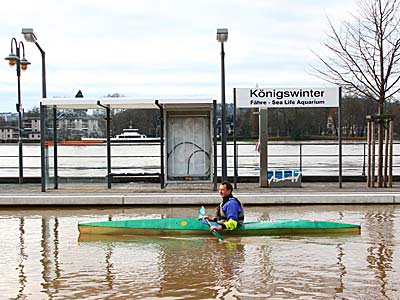 Während die Anrainer darauf hoffen, dass die Pegelstände - wie derweil unter anderem für den Pegel Oberwinter prognostiziert - zumindest vorerst weiter fallen, diente die sonst der Stadtbahn vorbehaltene Strecke noch als Ruder-Revier.