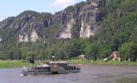 Am nächsten Tag paddelten wir bei strahlendem Sonnenschein weiter durch das vom Elbsandstein-Gebirge eingeengte Flusstal zum nächsten Etappenziel nach Pirna. Ständige Begleiter waren die neun restaurierten Raddampfer der "Sächsischen Dampfschifffahrt". Besonders das älteste Dampfschiff der Flotte, "Stadt Wehlen, Baujahr 1879", hat uns sehr beeindruckt.