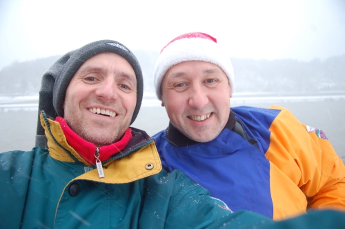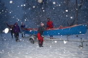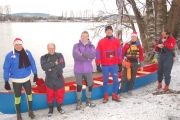 Nach kurzem Aufenthalt ging's weiter Richtung Heimat. By the Way stießen wir auf die Kanufreunde aus Unkel, die uns (traditionell) noch zu einem kleinen Umtrunk in ihr Bootshaus einluden. Hier war der Glühwein aber so heiß, dass er um trinkfähig zu sein mit Amaretto herunter gekühlt werden musste. Nach einer guten Stunde, mittlerweile hatte es stark angefangen zu schneien, machten wir uns auf den Heimweg, nicht ohne zuvor unsere beiden Boote von erheblichen Schneemassen befreit zu haben. Ralfs Einer war aus der Distanz zunächst gar nicht auffindbar.